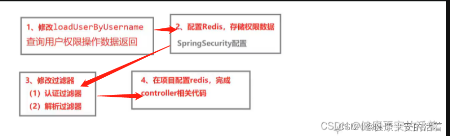 在认证过滤器中,存储用户的权限信息 ,把权限数据保存到redis中(用户名为key,权限数据为value即可),这样通过token获取用户名即可拿到权限数据,这样就可构成出完整的Authentication对象。