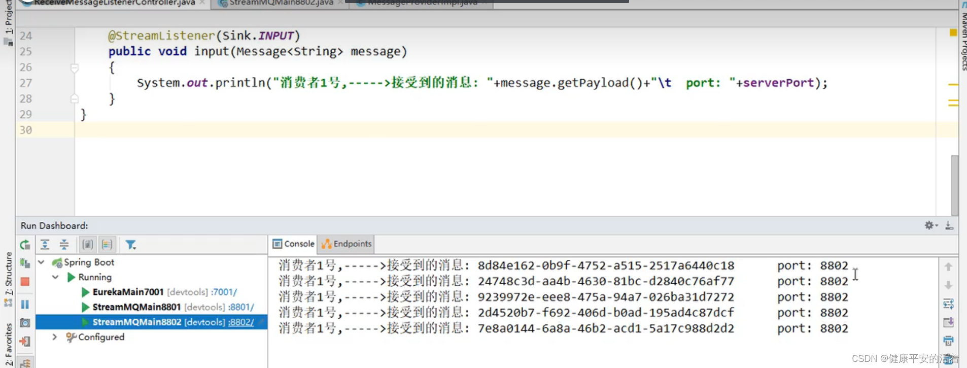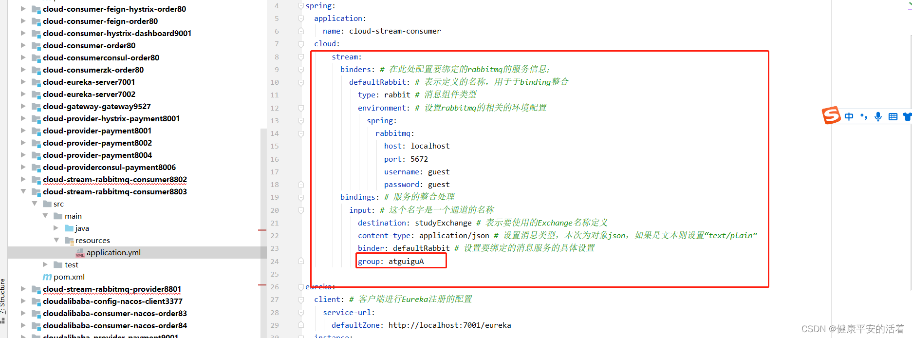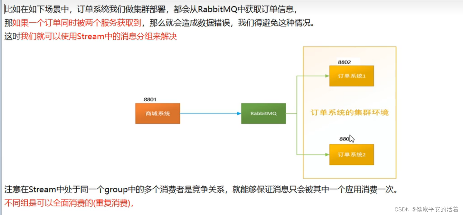 微服务应用放置同一个group中,就能够保证消息被同一个消费者进行消费。不同的组是可以消费的,同一个组存在竞争关系,只有其中一个消费者可以消费。