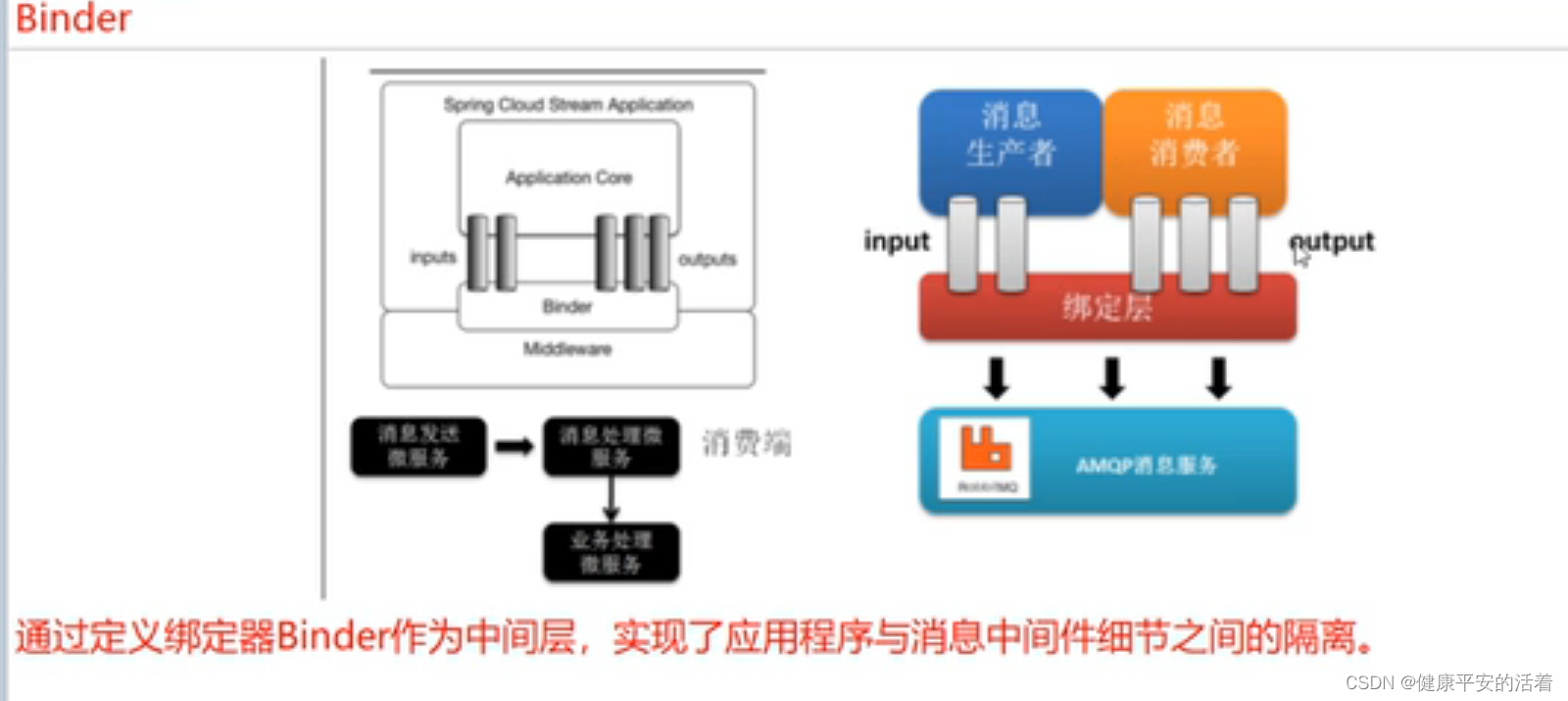 通过定义绑定器Binder作为中间层,实现了应用程序与消息中间件细节之间的隔离。