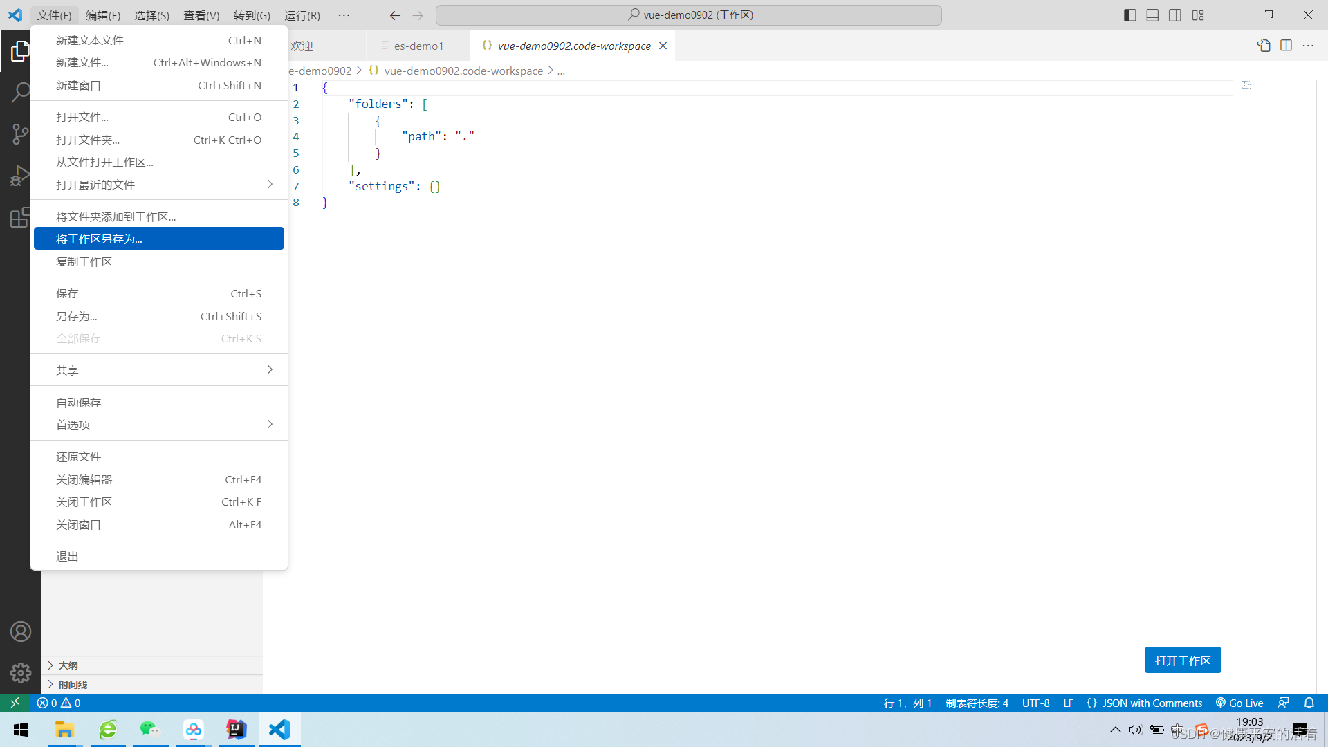 打开文件夹后,选择“文件 -> 将工作区另存为...”,为工作区文件起一个名字,存储在刚才的文件夹下即可
