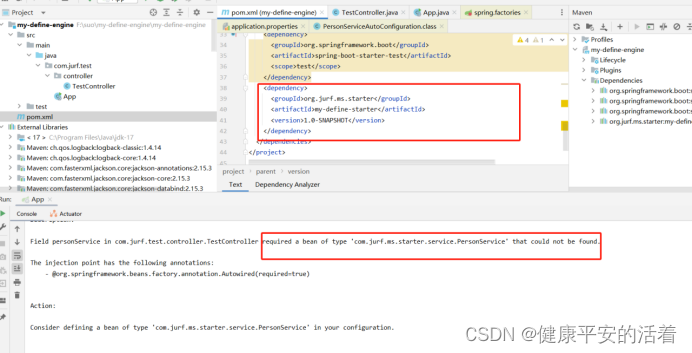 3.在my-define-engine 工程添加 my-define-starter 工程依赖,服务启动调用,提示无法扫描到my-define-starter工程中class文件。3.x后这么定义发现无法生效。