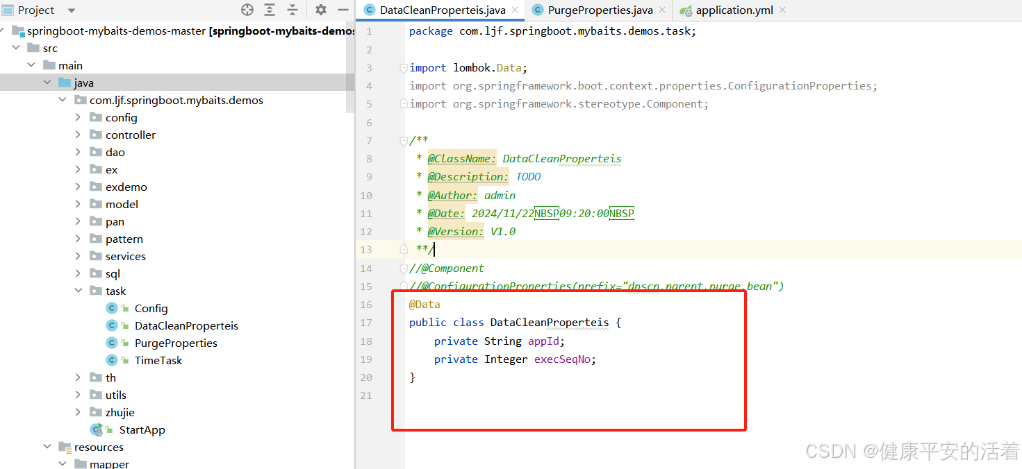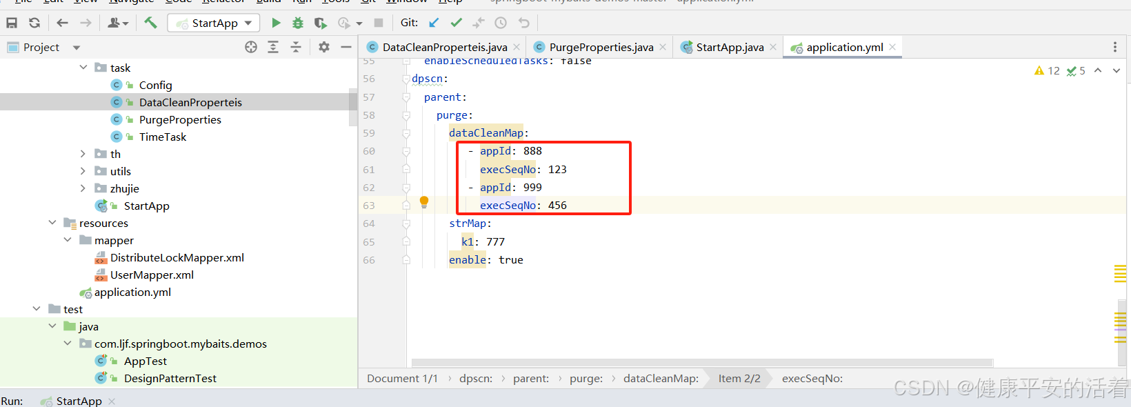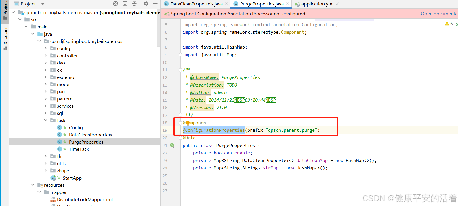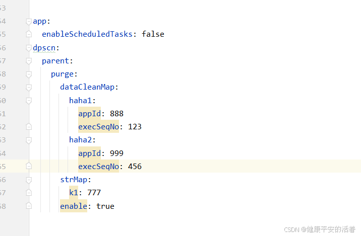 其中dpscn.parent,purge作为前缀,dataCleanMap为PurgeProperties类中的属性字段,因为map类型,值为javabean对象,需要存储多个bean对象,配置文件中haha1,haha2为一个个对象的别名。必须定义,否则获取不到