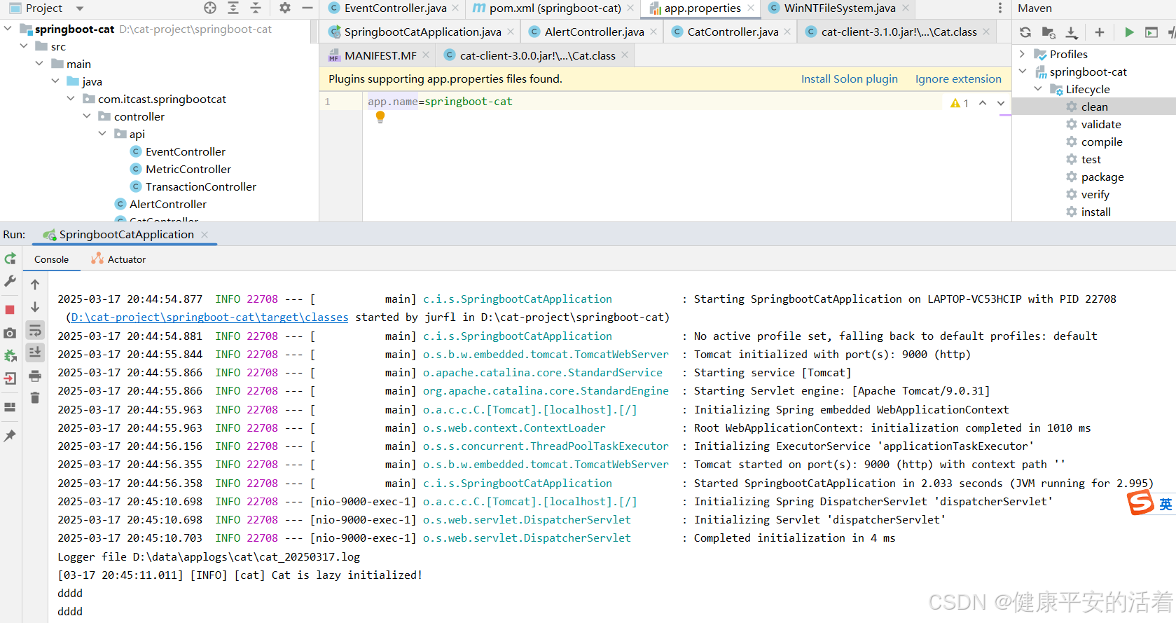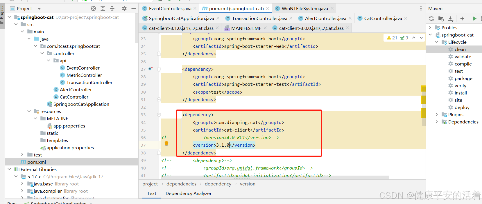 使用cat-client 3.0.0 这个坐标因为是从阿里云仓库拉不下来,自己通过命令打入到本地仓库,程序启动时候,进行调用发现报有些包找不到,折腾大半夜,后来: 这里找不到cat-client 3.0.0 改成了3.1.0;可以从这个网址查看