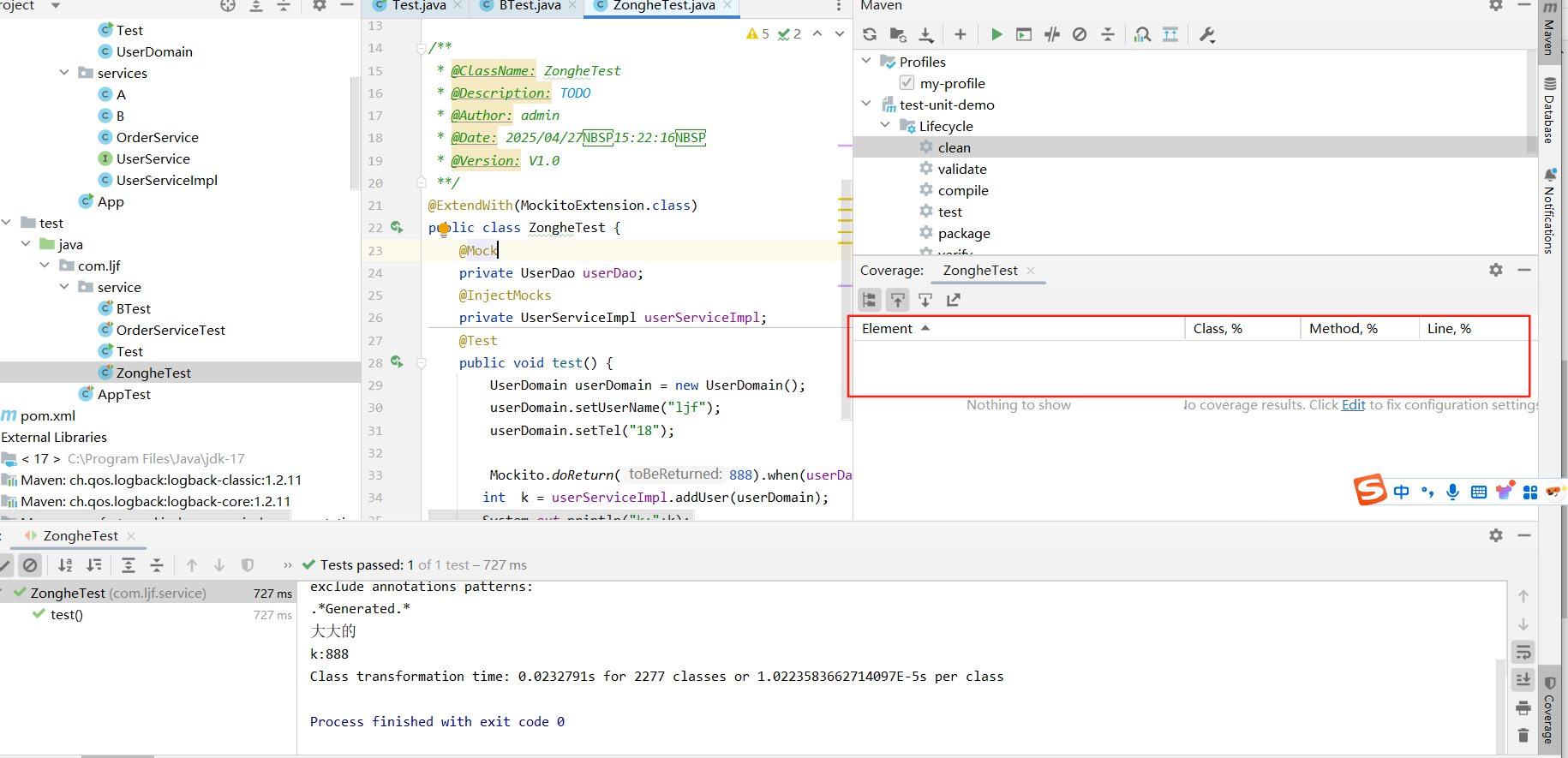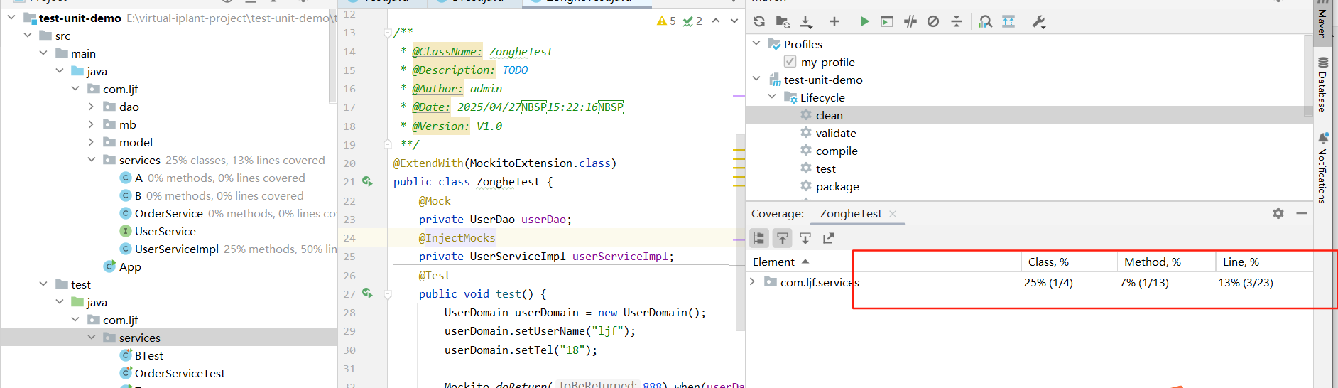 经过长时间的问题排查,发现单测的包名和src下实际的包名不一致造成,修改成一致,再进行测试,如图: