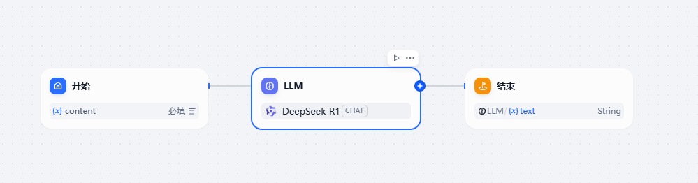 在开始节点中接收一个输入信息 content 然后在LLM模型中我们需要配置一个CHAT模型,这里选择了DeepSeek-R1 64K的聊 天模型,注意需要在这里设置下对应的提示词