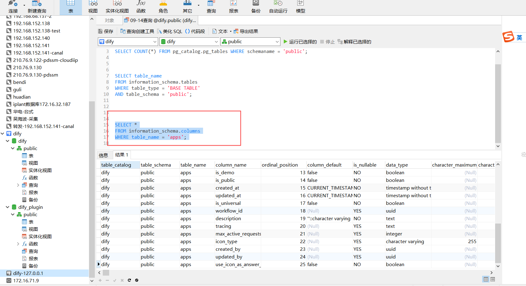 Dify 使用数据库(如 PostgreSQL 或 MySQL)来存储项目、应用、对话记录等各种数据。要查看这些数据,您不能像在代码里一样直接使用 SQLAlchemy 查询,而是需要通过其他方式访问其数据库。