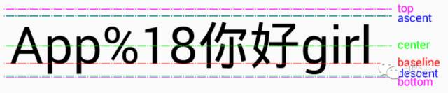 因为它的y坐标位置是baseline,而不是我们想象中的bottom。请看下图(ascent与参考的博客有点不一样,但不用怀疑我这的准确性,因为这图是直接通过自定义控件绘制出来的)