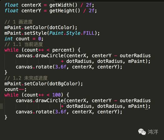 求出了圆点半径,圆点圆心所在的位置也知道了。画圆点,一圈共100个,可以使用了canvas的旋转来绘制,每绘制一个圆点,就旋转3.6°(360°/100)。