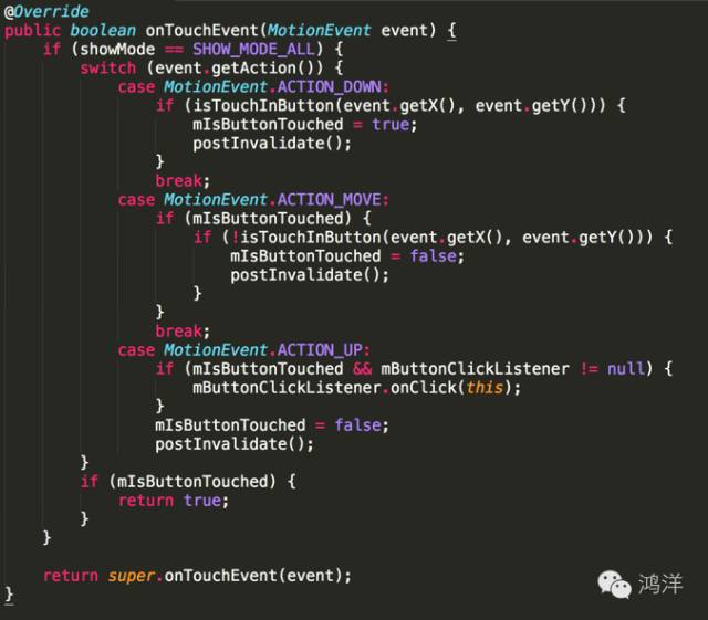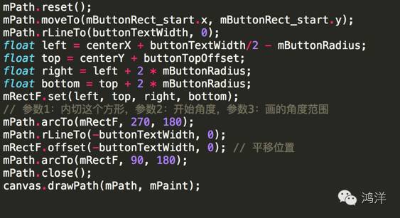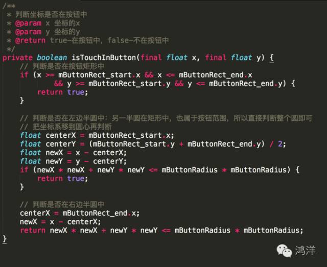 要处理按钮的点击事件,首先要判断触摸点是否在按钮中,跟绘制一样,分别判断是否在方形、左半圆、右半圆中。