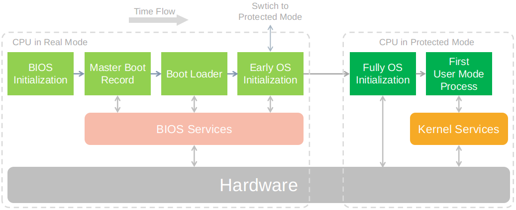 计算机系统的启动过程是非常复杂的,也诞生了很多流派,比如BIOS-MBR启动方式、UEFI-GPT启动方式等。不管是哪个流派,广义上的启动过程是类似的,以BIOS-MBR为例,可以简化为如下步骤: