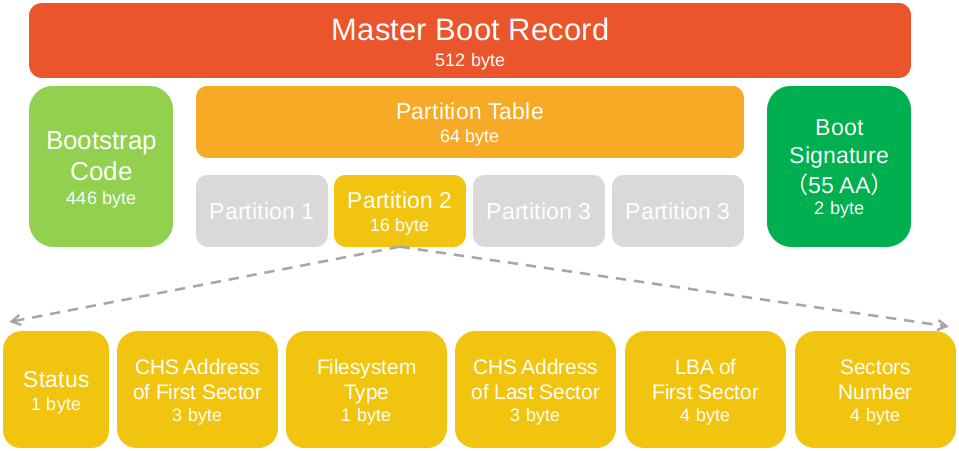 - 第447-510字节:设备分区表(Partition table),描述4个主分区的详细信息,包括该分区的起始位置、文件系统和可用状态等