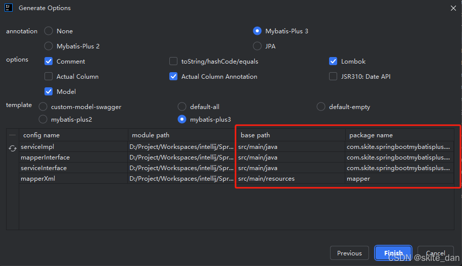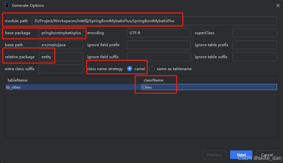 修改module为本次项目,relative package为实体类的包名,base package为实体类包的上层包路径。className为生成实体类的名称,如下: