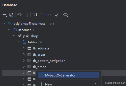 在需要创建代码的库表上点击右键,选择mybatisX-generator,如下: