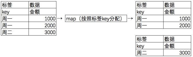 3 接下来会进行一个分发操作,即相同标签(key)的数据会被收集到一起。