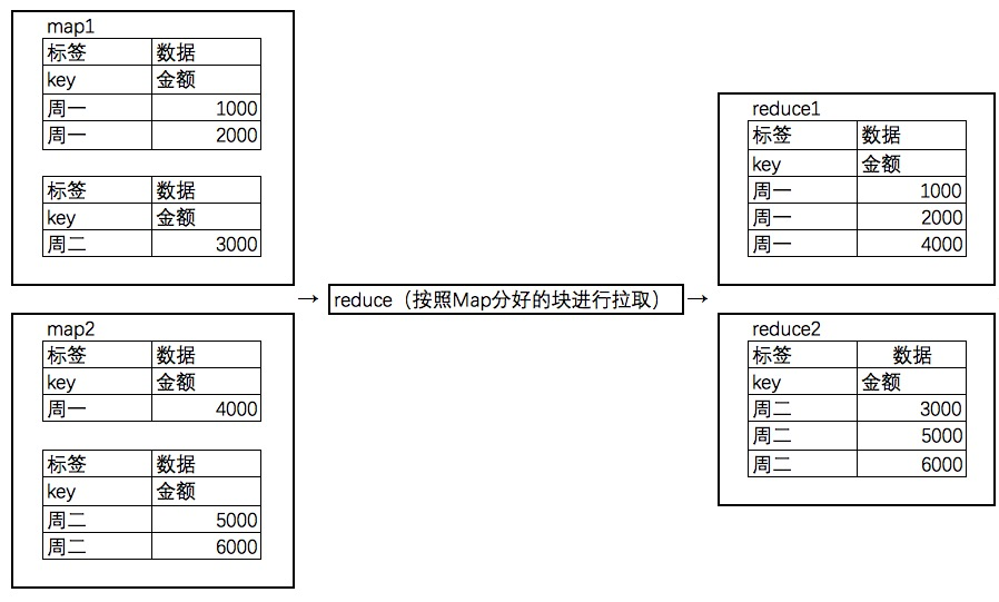 1 map先从HDFS上读取不同的文件,然后对其进行map操作,生成一个个带有标签(也就是key)的数据块。