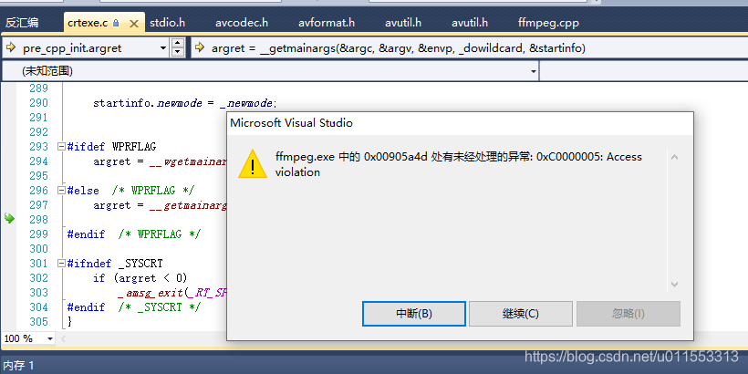 起因是这样的,本来想在我的VS2010上利用ffmpeg写点东西,但是代码才写了一行,编译通过但是运行之后就报如下问题,程序自动退出了。代码和现象如下: