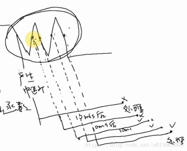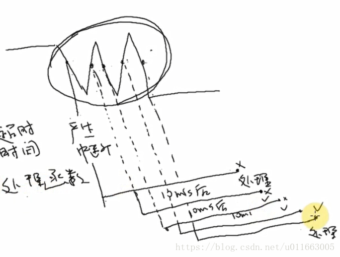 在中断中加定时器,当遇到 A 中断时加一个 10ms 的定时器,过了 10ms 后就去执行“处理函数”(确定按键值上报)。因为机械的抖动会非常快,没等到 10ms 后的处理,这时因为抖动又来了一个中断 B,这时中断 B 把之前的那个定时器修改了。所以 A 中断的定时器就取消了。最后又来了一个中断 C,同样会修改掉 B 中断的定时器。上图中是假设抖动时产生了 3 个中断,所以对于同一个“定时器”,最终中断 C 的定时器没有被修改,所以 10ms 后由中断 C 的处理函数上报了按键值。最后这个 10ms 是从抖动 C 处开始。这样 3 个抖动的中断只会导致最后处理一个“上报按键值”(定时器过后的处理函数只会执行一次)。以上便是用定时器消除抖动的原理。因为是修改同一个定时器,所以前面的定时又取消,相当于把“闹钟”时间往后调整时,最终只要响一次闹铃。