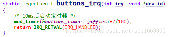 now:为了防抖动,现在只要有按键按下进入中断处理函数buttons_irq中,首先获取设备号,然后修改定时器的超时时间为10ms以后,之后便直接返回而不采取任何操作。