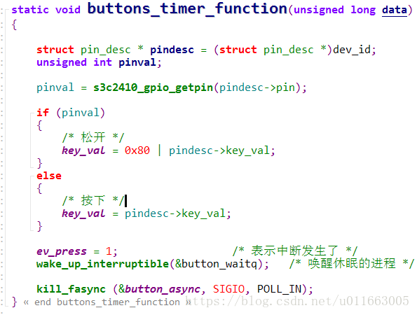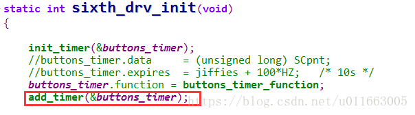 要启用定时器,还必须通过add_timer()函数将定义好的定时器加入到内核中,主要任务是告诉内核,当定时器中设置好的超时时间到了之后,内核就会自动调用buttons_timer_function函数。