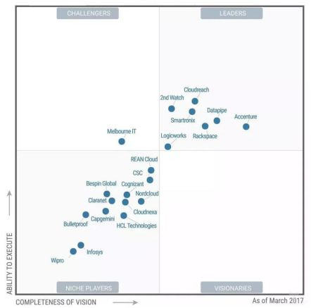 2017年3月,Gartner发布了首个公有云托管服务提供商(MSP)魔力象限。(云MSP:全称Cloud Management Service Provider,指对接一家或者多家公有云服务厂商为企业提供上云、开发、运维等专业服务。)