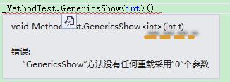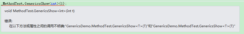 调用代码:_MethodTest.GenericsShow<int>(1); 这样依赖,泛型方法在申明的时候能够实现类似于Objet的效果,在调用时先确定类型,这样就达到了安全检查的目的。 泛型就像是使用了一个类型占位符,而这一特性在使用集合时更能体现其强大之处。 也正是由于泛型太强大了,强大得像孙悟空一样,我们需要弄一道紧箍咒来对其进行束缚,否则不容易控制。这时,就有了泛型约束,它在泛型方法或者泛型委托声明之时就对其进行限定。限定关键字通过where。 public class Student { public string Name { get; set; } } public void StudentShow<T>(T t) where T : Student { Console.WriteLine(string.Format("GenericsShow方法,参数类型{0}", t.GetType())); } public void GenericsShow<T>(T t) { Console.WriteLine(string.Format("GenericsShow方法,参数类型{0}", t.GetType())); } public void GenericsShow<T>(T t) { Console.WriteLine(string.Format("GenericsShow方法2,参数类型{0}", t.GetType())); } 需要注意的是,这里使用了泛型重载,这个时候编译是可以正常通过的,可是注意了,调用的时候就出现问题了 |