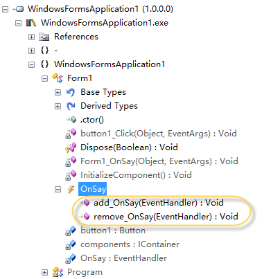 按自己的想法去理解事件和泛型(C#) 上一篇那些年困扰我们的委托(C#)讲了委托,这一篇自然就轮到事件了。 不喜欢官方的表达方式,喜欢按照自己的想法去理解一些抽象的东西,我是一个喜欢简单怕麻烦的人。 事件 考虑到委托使用的一些缺陷,就有了事件。委托是不安全的,打个比方,如果把委托当作共有字段,那么事件就相当于是属性的概念。 事件就是被限制使用的委托变量,事件里面封装了一个多播委托。 事件语法:public event 委托类型 事件名; 事件的作用:事件的作用与委托变量一样,只是功能上比委托变量有更多的限制。比如:只能通过+=或者-=来绑定方法。只能在类内部调用事件。 当一个结果发生时,有可能引起另外的一些反应,这就好像因果关系。而事件则是这个因与果的内部联系。 事件的本质:委托的一个实例,添加了event关键字修饰。 委托是一种类型,事件是委托类型的实例。 和委托的区别: 事件不能用=来注册方法。(防止外面直接赋值为null,导致注册失效) 事件不能被外部调用(安全性控制) 整个windows系统都是通过事件驱动的,事件都有触发条件。 在WebForm或者WinForm中,我们经常看到: private void button1_Click(object sender, EventArgs e) { //代码 } 上面是一个按钮的单击事件。从上可以看到三个事件因素: 对象:button 事件名:click 参数:object sender,事件源,在这里其实就是button,eventArgs e是事件需要的资源数据。 我们在Winform中都是通过如下的方式来注册事件的。 this.button1.Click += new System.EventHandler(this.button1_Click); EventHandler就是一个委托: public delegate void EventHandler(object sender, EventArgs e); 这也就是为什么我们注册的事件总是有sender和e这两个参数,因为委托就是这样声明的。我们来自定义一个事件: public event EventHandler OnSay; public Form1() { InitializeComponent(); OnSay += Form1_OnSay; } void Form1_OnSay(object sender, EventArgs e) { Console.Write("你好吗"); } 我们通过Reflector工具来查看: |
