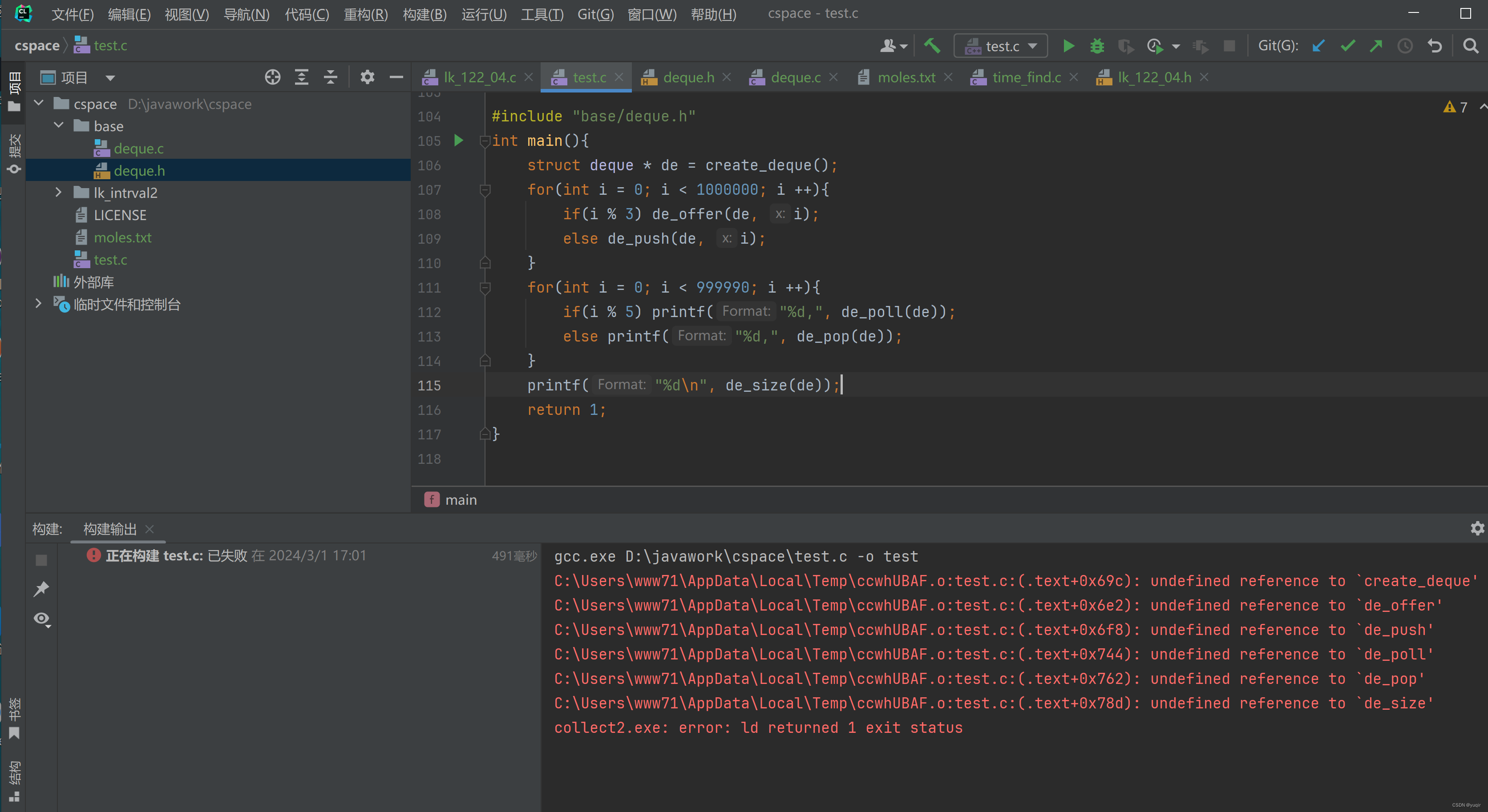 这是clion,deque.c是我自己写的,引入头文件后,无法正常调用函数