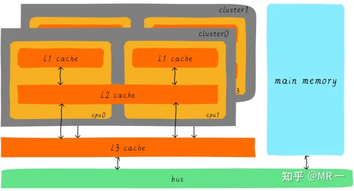 在Cortex-A53架构上,L1 cache分为单独的instruction cache(ICache)和data cache(DCache)。L1 cache是CPU私有的,每个CPU都有一个L1 cache。一个cluster 内的所有CPU共享一个L2 cache,L2 cache不区分指令和数据,都可以缓存。所有cluster之间共享L3 cache。L3 cache通过总线和主存相连。