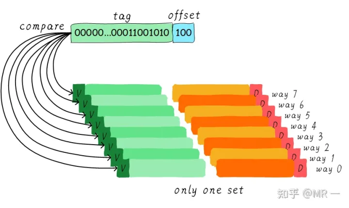 由于所有的cache line都在一个组内,因此地址中不需要set index部分。因为,只有一个组让你选择,间接来说就是你没得选。我们根据地址中的tag部分和所有的cache line对应的tag进行比较(硬件上可能并行比较也可能串行比较)。哪个tag比较相等,就意味着命中某个cache line。因此,在全相连缓存中,任意地址的数据可以缓存在任意的cache line中。所以,这可以最大程度的降低cache颠簸的频率。但是硬件成本上也是更高。