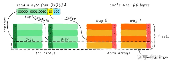 cache被分成2路,每路包含4行cache line。我们将所有索引一样的cache line组合在一起称之为组。例如,上图中一个组有两个cache line,总共4个组。我们依然假设从地址0x0654地址读取一个字节数据。由于cache line size是8 Bytes,因此offset需要3 bits,这和之前直接映射缓存一样。不一样的地方是index,在两路组相连缓存中,index只需要2 bits,因为一路只有4行cache line。上面的例子根据index找到第2行cache line(从0开始计算),第2行对应2个cache line,分别对应way 0和way 1。因此index也可以称作set index(组索引)。先根据index找到set,然后将组内的所有cache line对应的tag取出来和地址中的tag部分对比,如果其中一个相等就意味着命中。