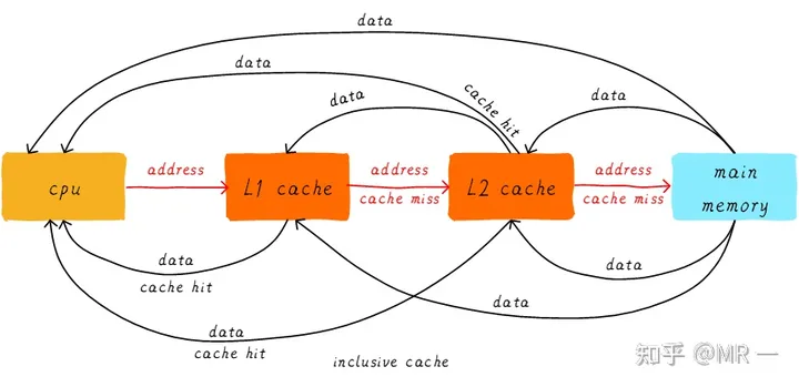 首先引入两个名词概念,命中和缺失。 CPU要访问的数据在cache中有缓存,称为“命中” (hit),反之则称为“缺失” (miss)。多级cache之间是如何配合工作的呢?我们假设现在考虑的系统只有两级cache。