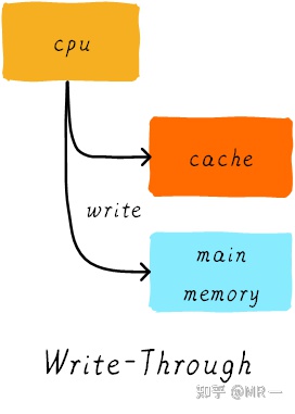 当CPU执行store指令并在cache命中时,我们更新cache中的数据并且更新主存中的数据。cache和主存的数据始终保持一致。