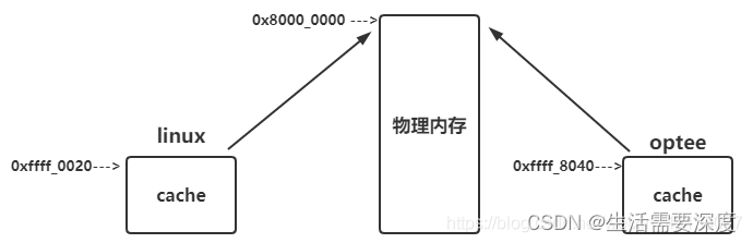 如果是VIVT的cache(virtual index virtual tag),在linux kernel中有一份地址空间,在optee中也有一份地址空间。linux kernel和optee通过share memory进行通信。 对于同一块物理地址,在linux kernel和optee中映射的虚拟地址是不同的, 所以对于该物理地址的数据,在linux kernel和optee中,缓存到了不同的cache中: