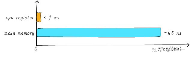 其实现实中,CPU通用寄存器的速度和主存之间存在着太大的差异。两者之间的速度大致如下关系: