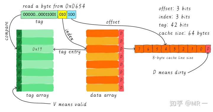 我们一共有8行cache line,cache line大小是8 Bytes。所以我们可以利用地址低3 bits(如上图地址蓝色部分)用来寻址8 bytes中某一字节,我们称这部分bit组合为offset。同理,8行cache line,为了覆盖所有行。我们需要3 bits(如上图地址黄色部分)查找某一行,这部分地址部分称之为index。现在我们知道,如果两个不同的地址,其地址的bit3-bit5如果完全一样的话,那么这两个地址经过硬件散列之后都会找到同一个cache line。所以,当我们找到cache line之后,只代表我们访问的地址对应的数据可能存在这个cache line中,但是也有可能是其他地址对应的数据。所以,我们又引入tag array区域,tag array和data array一一对应。每一个cache line都对应唯一一个tag,tag中保存的是整个地址位宽去除index和offset使用的bit剩余部分(如上图地址绿色部分)。tag、index和offset三者组合就可以唯一确定一个地址了。因此,当我们根据地址中index位找到cache line后,取出当前cache line对应的tag,然后和地址中的tag进行比较,如果相等,这说明cache命中。如果不相等,说明当前cache line存储的是其他地址的数据,这就是cache缺失。在上述图中,我们看到tag的值是0x19,和地址中的tag部分相等,因此在本次访问会命中。由于tag的引入,因此解答了我们之前的一个疑问“为什么硬件cache line不做成一个字节?”。这样会导致硬件成本的上升,因为原本8个字节对应一个tag,现在需要8个tag,占用了很多内存。