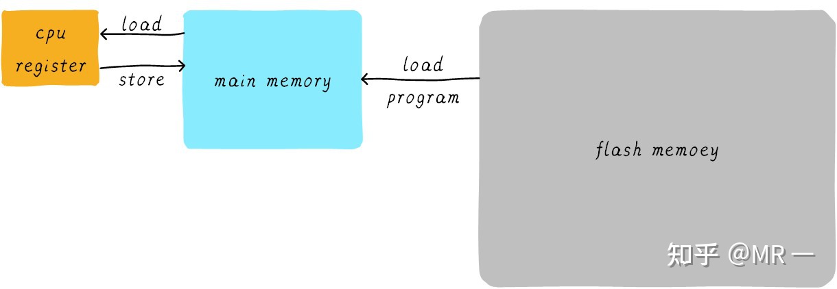 在思考cache是什么之前我们首先先来思考第一个问题:我们的程序是如何运行起来的?我们应该知道程序是运行在 RAM之中,RAM 就是我们常说的DDR(例如 DDR3、DDR4等)。我们称之为main memory(主存)当我们需要运行一个进程的时候,首先会从Flash设备(例如,eMMC、UFS等)中将可执行程序load到main memory中,然后开始执行。在CPU内部存在一堆的通用寄存器(register)。如果CPU需要将一个变量(假设地址是A)加1,一般分为以下3个步骤: