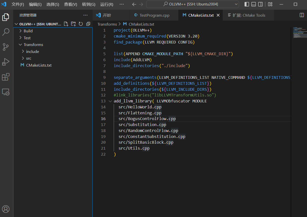 在这个文件夹里创建一个OLLVM++文件夹,来保存这次的项目,然后在本机的vscode上使用remote - ssh插件连接到虚拟机,并且打开这个文件夹,在OLLVM++文件夹中创建Build和Test文件夹,后续分别用于储存编译后 LLVM Pass以及测试程序。
