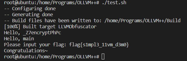 cd ./Build cmake ../Transforms make cd ../Test clang -S -emit-llvm TestProgram.cpp -o TestProgram.ll opt -load ../Build/LLVMObfuscator.so -hlw -S TestProgram.ll -o TestProgram_hlw.ll clang TestProgram_hlw.ll -o TestProgram_hlw ./TestProgram_hlw