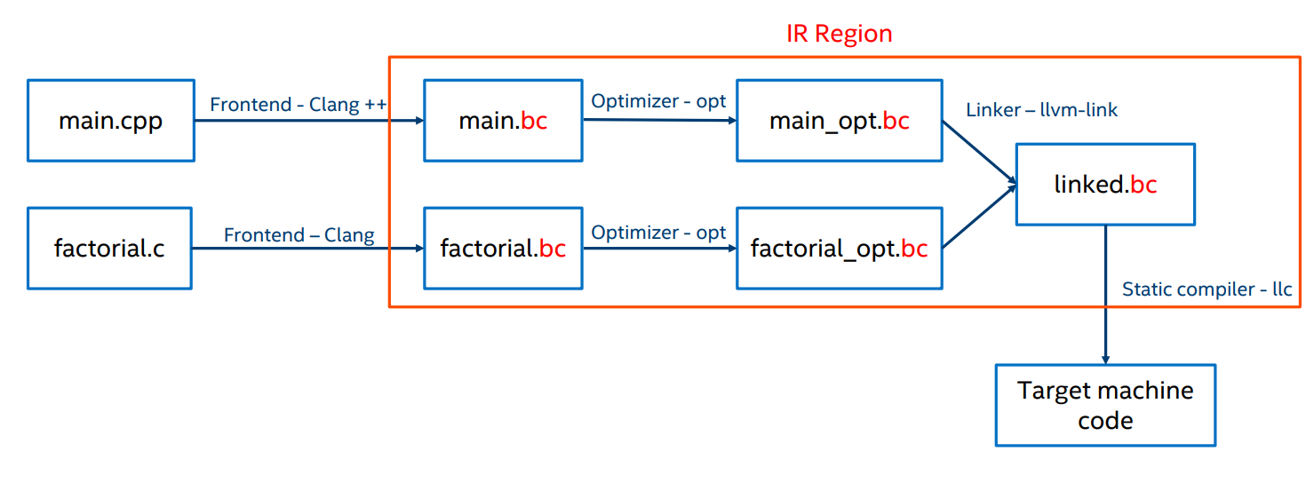 这里给出了一次具体的编译过程。main.cpp和factorial.c各自经过前端Clang翻译变成中间代码.bc文件,随后.bc各自经过优化器进行优化,得到优化后的代码main_obt.bc和factorial_opt.bc,这两个文件经过LLVM IR层面的链接器(llvm-link)合并为一个中间代码文件linked.bc,最后经过静态编译器(llc)进行编译,得到目标平台的机器代码。