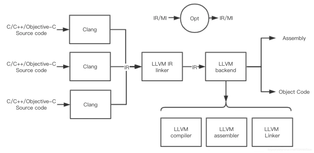 注意一下Linker,为了实现链接时优化,LLVM在前端(Clang)生成单个代码单元的IR后,将整个工程的IR都链接起来,同时做链接时优化。之后的compiler只编译LLVM IR。
