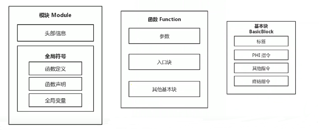 LLVM PASS框架中最核心的三个类是Function, BasicBlock和Instruction,分别对应IR中的函数、基本块和指令。