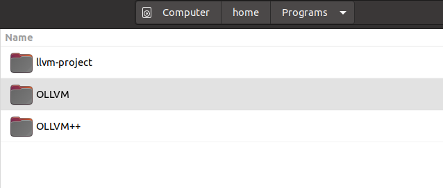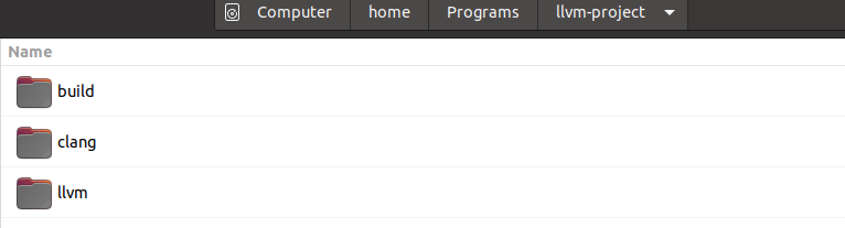 然后创建一个你想要放llvm的路径,我是/home/llvm/Programs/llvm-project,在这个文件夹里解压两个源码包,分别命名为llvm和clang,然后把两个文件夹放进build文件夹,大概是下面这个样子