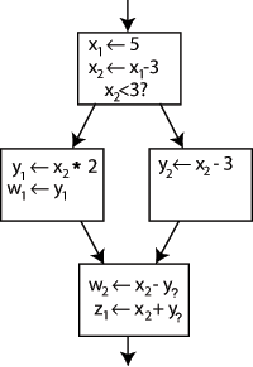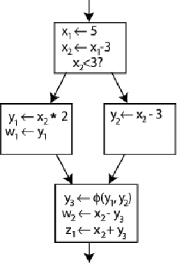 我们在内存访问和寻址操作那里介绍了SSA,并且给出了两个流程图转换的例子。但是,我们注意到这种转换存在一个问题:转换后的最后一个基本块内,到底是用y1y1还是y2y2?如果程序是往左边走下来的那应该是y1y1,右边走下来的话就是y2y2。
