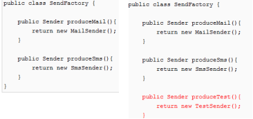举个例子,多工厂模式需要增加一个新的功能,需要修改工厂类,如下图所示