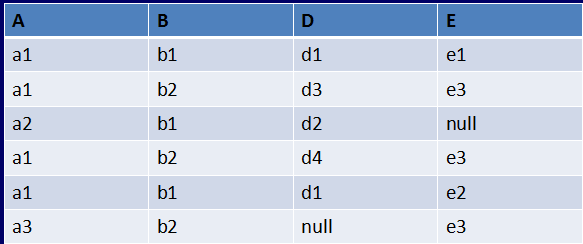 <a2,b1,d2> 右边没有匹配的元祖是 <a3,b2,e3> ,把这2个元组加入自然连接的表中,然后没有值的属性就赋值为null,如下图