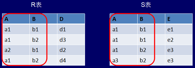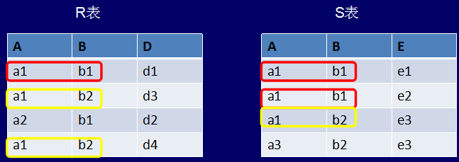 1.1找出2个表中相同的属性组: 属性A加上属性B