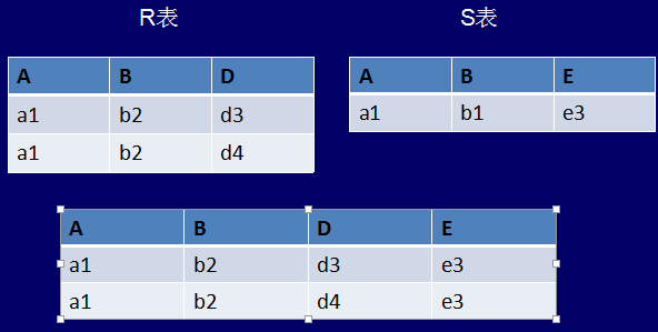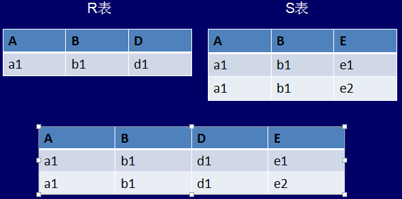 结果基于表R和S的笛卡尔乘积,取对应的R和S中相同属性组都相同的值,同时相同属性组只保留一个