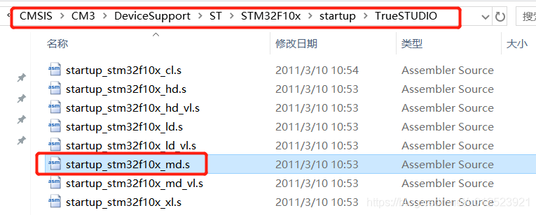 下的startup_stm32f10x_md.s放在工程目录下的startup文件夹下,并将后缀改成大写.S。这个文件的选择要根据自己选用的单片机型号的大、中、小容量进行选择,我用的是STM32F103C8T6,属于中容量,所以选择startup_stm32f10x_md.s