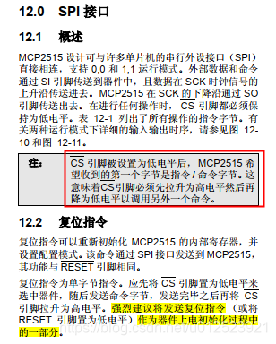 由于SPI初始化完成后,直接将CS拉低就发送命令,mcp2515是收不到命令的,看到下面图中红色框框中的描述就知道原因了,所以真正的原因不是上面描述的加延时的问题,而是CS需要先上拉的问题。