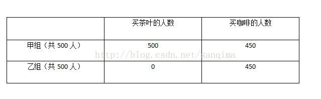 例1,已知有1000名顾客买年货,分为甲乙两组,每组各500人,其中甲组有500人买了茶叶,同时又有450人买了咖啡;乙组有450人买了咖啡,如表(1)所示: